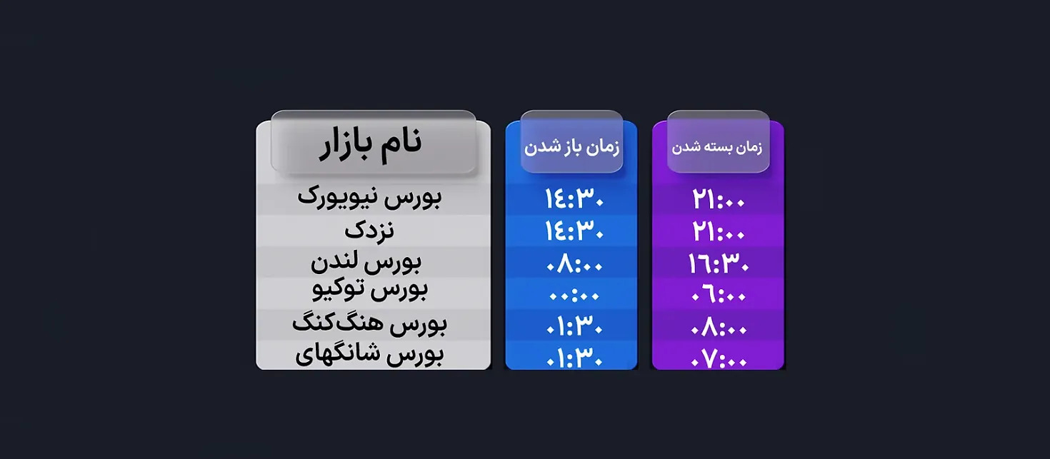 برای دریافت جزئیات بیشتر در خصوص بازار بورس جهان، میتوانید از ابزار ساعت کار بازار بورس سهام جهانی استفاده نمایید.